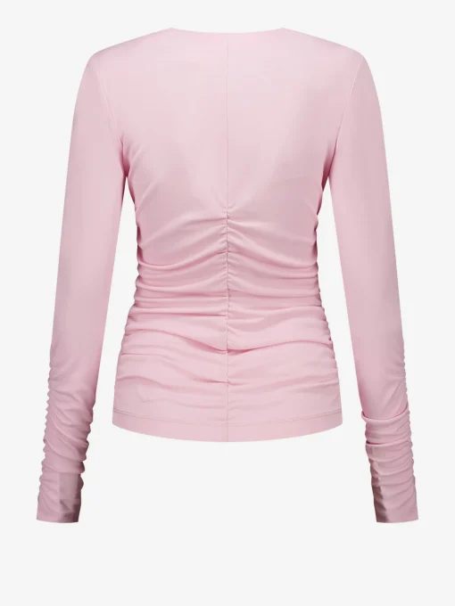 Gedrapeerde top met een aansluitende pasvorm en eenV-hals, afgewerkt met een bloemendetail bij de halslijn.