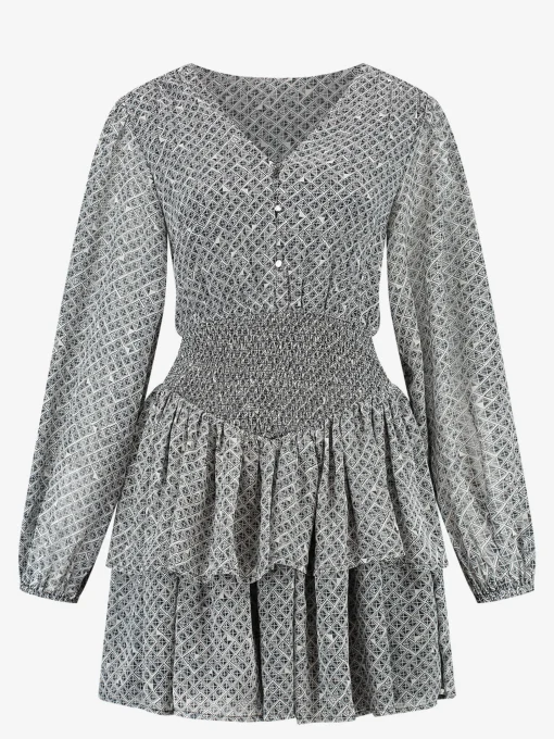 Jurk met een all-over print, V-hals, knoopsluiting en eenA-lijn pasvorm. De jurk heeft een elastische taille en gelaagde ruches.