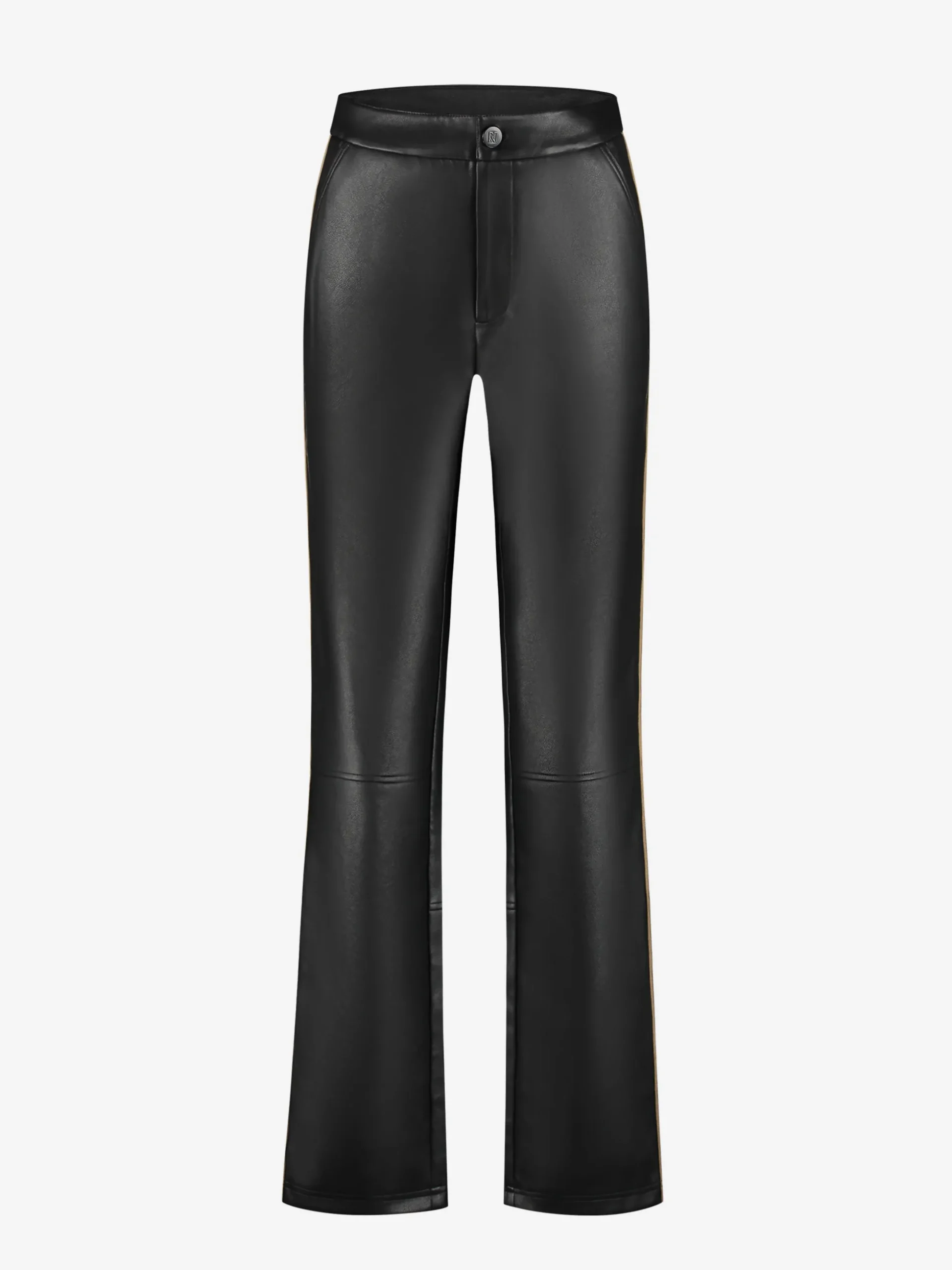 Leren look broek met bies aan zijkant en rechte pijpen. De broek heeft een middelhoge taille, een rits- en knoopsluiting en medium stretch.