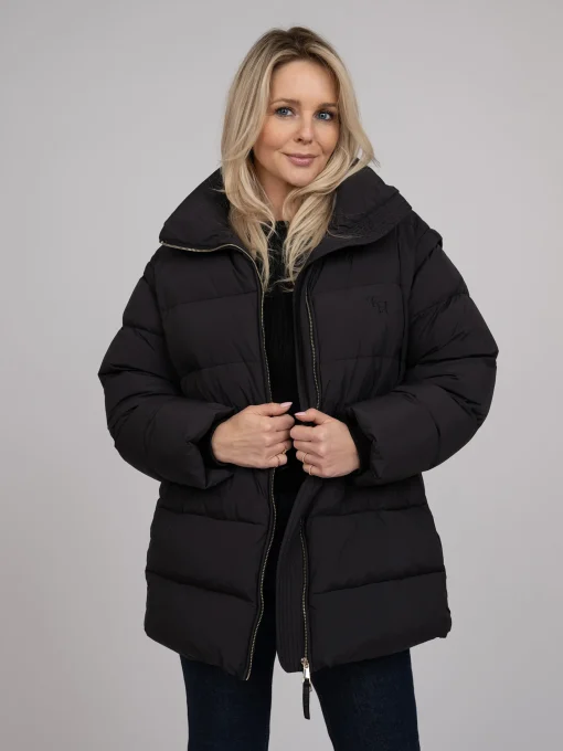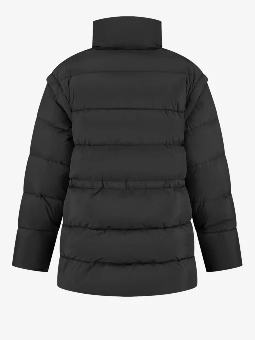 Korte puffer jas met getailleerde taille en afneembaremouwen. De jas is voorzien van een ritsluiting, handige zakken en een hogekraag.