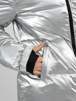 Deze ski jas heeft een metallic look en is uitgerust meteen hoge kraag en ritssluiting. Met een waterproof niveau van 10.000 mm blijvende vullingen droog, hoewel de buitenkant niet waterdicht is. De jas beschiktover sneeuwvangers aan de onderkant, een zakje voor je skipas op de mouw, enritszakken aan de voorkant en binnenkant. Daarnaast heeft de jas eenlosvallende pasvorm zonder stretch.