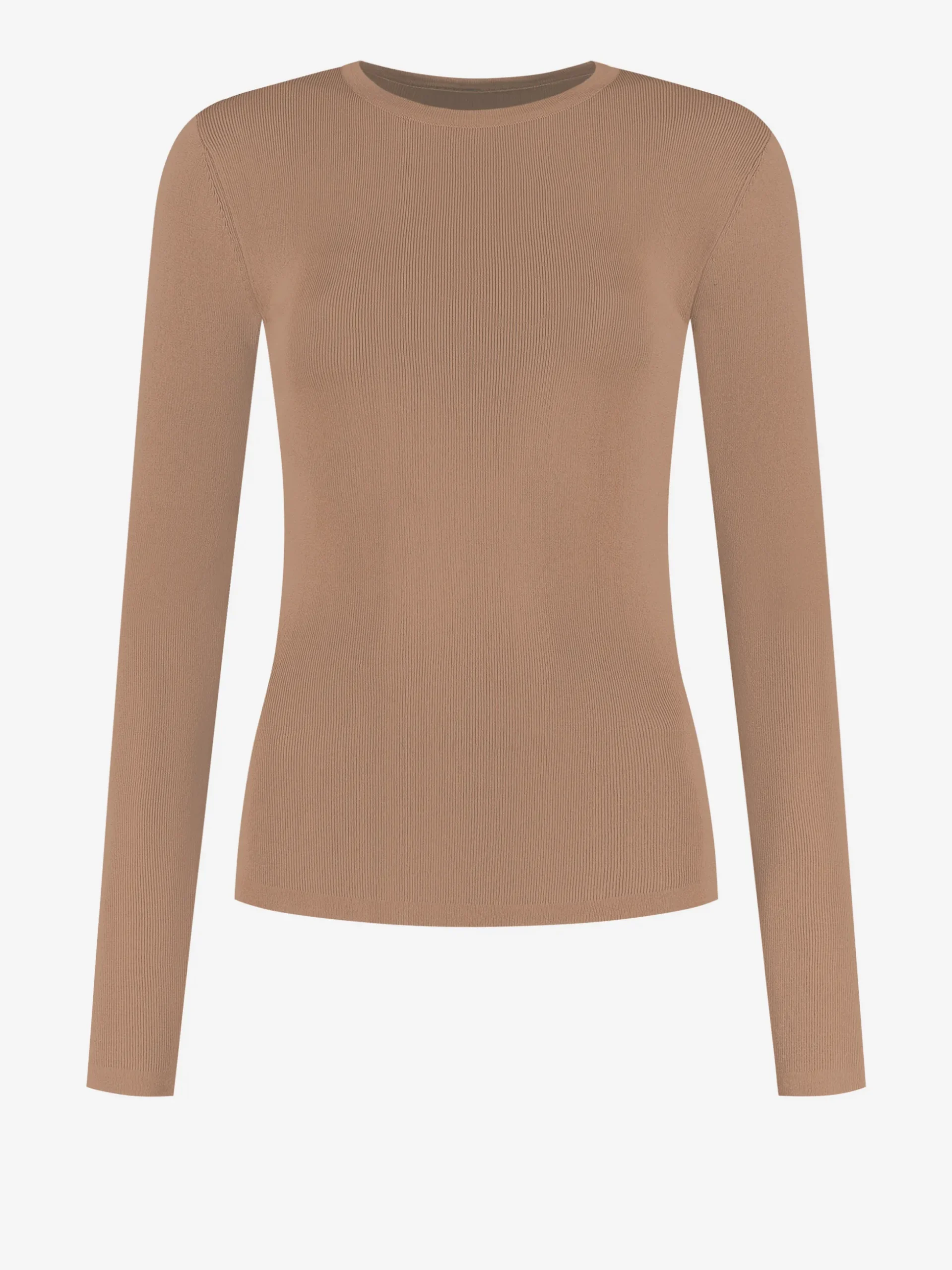 Geribbelde top met een getailleerde pasvorm, rondehalslijn en lange mouwen.