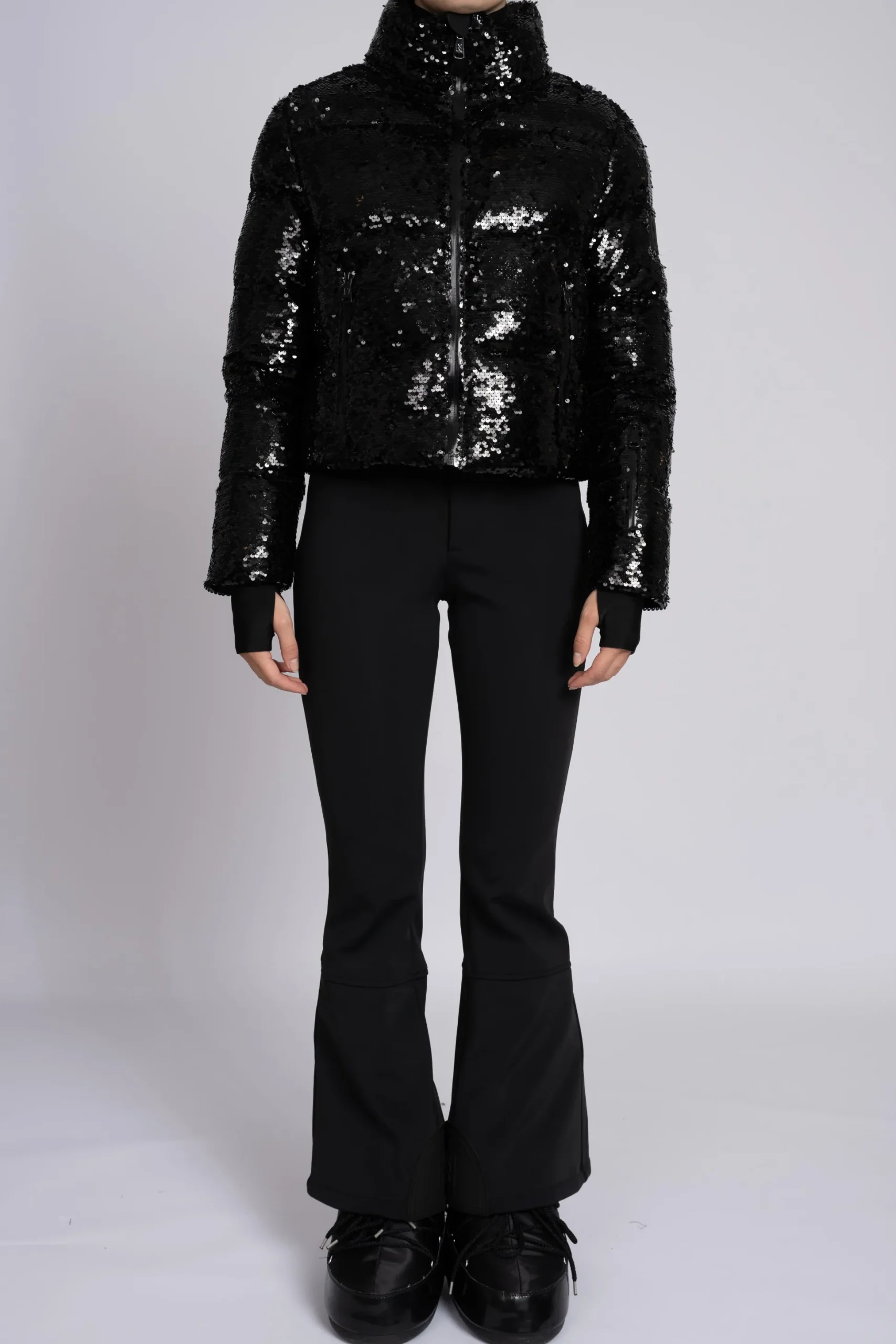 Deze pailletten jas heeft een ritssluiting en eenopstaande kraag, met waterdichte ritsen. De jas is uitgerust met sneeuwvangersaan de onderkant en mouwen, ritszakken, binnenzakken en een speciaal vakje vooreen skipas in de mouw. Onder de pailletten biedt de jas eenwaterdichtheidsniveau van 10.000 mm.