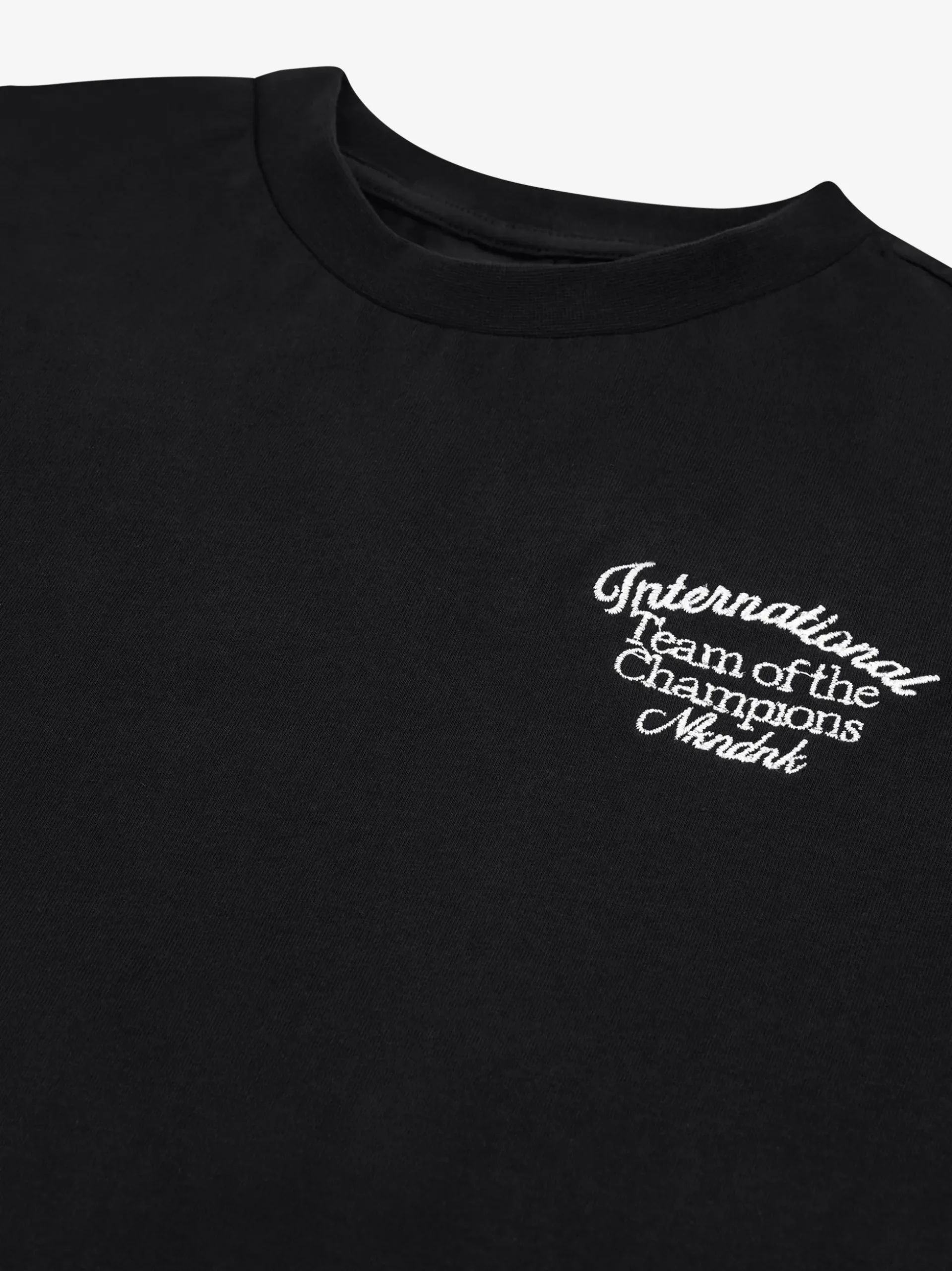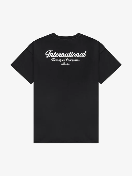T-shirt met geborduurde tekst op de rug en borst. Het T-shirt heeft een ronde hals en een losvallende pasvorm.