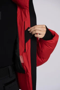 Deze effen ski jas is voorzien van een ritssluiting eneen opstaande kraag met een uitvouwbare capuchon. De jas beschikt overwaterdichte ritsen met logo en sneeuwvangers bij de mouwen. Daarnaast zijn erritszakken, binnenzakken en een opbergvakje voor de skipas in de mouw. De jasheeft een waterproof level van 10,000 mm en een breathability level van 5000 mm.